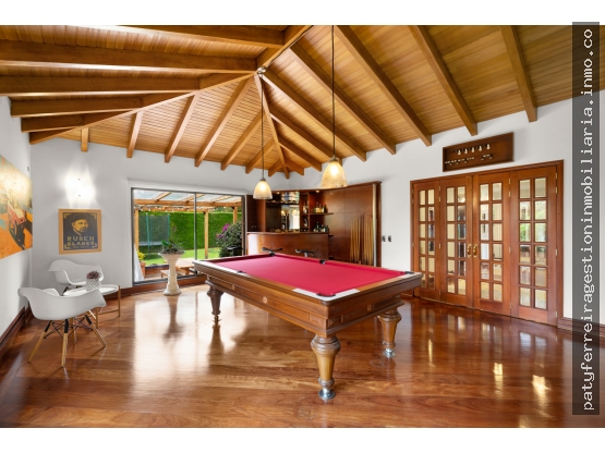 Hall de acceso en mármol lo conducen a la amplia sala con chimenea y ventanal al jardín, al lado y de manera independiente el comedor con acceso a la cocina y a las terrazas exteriores, ambos con piso de madera.